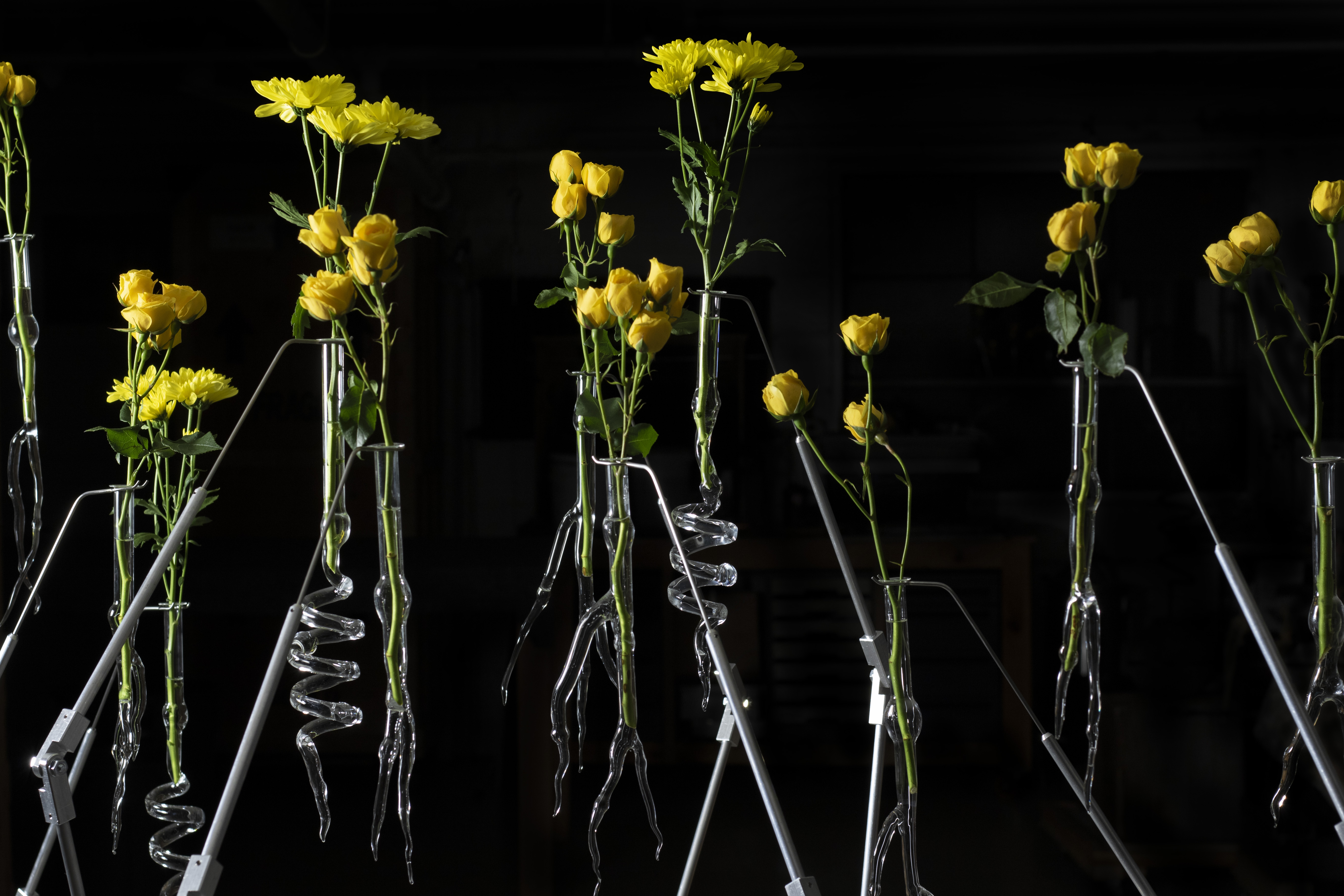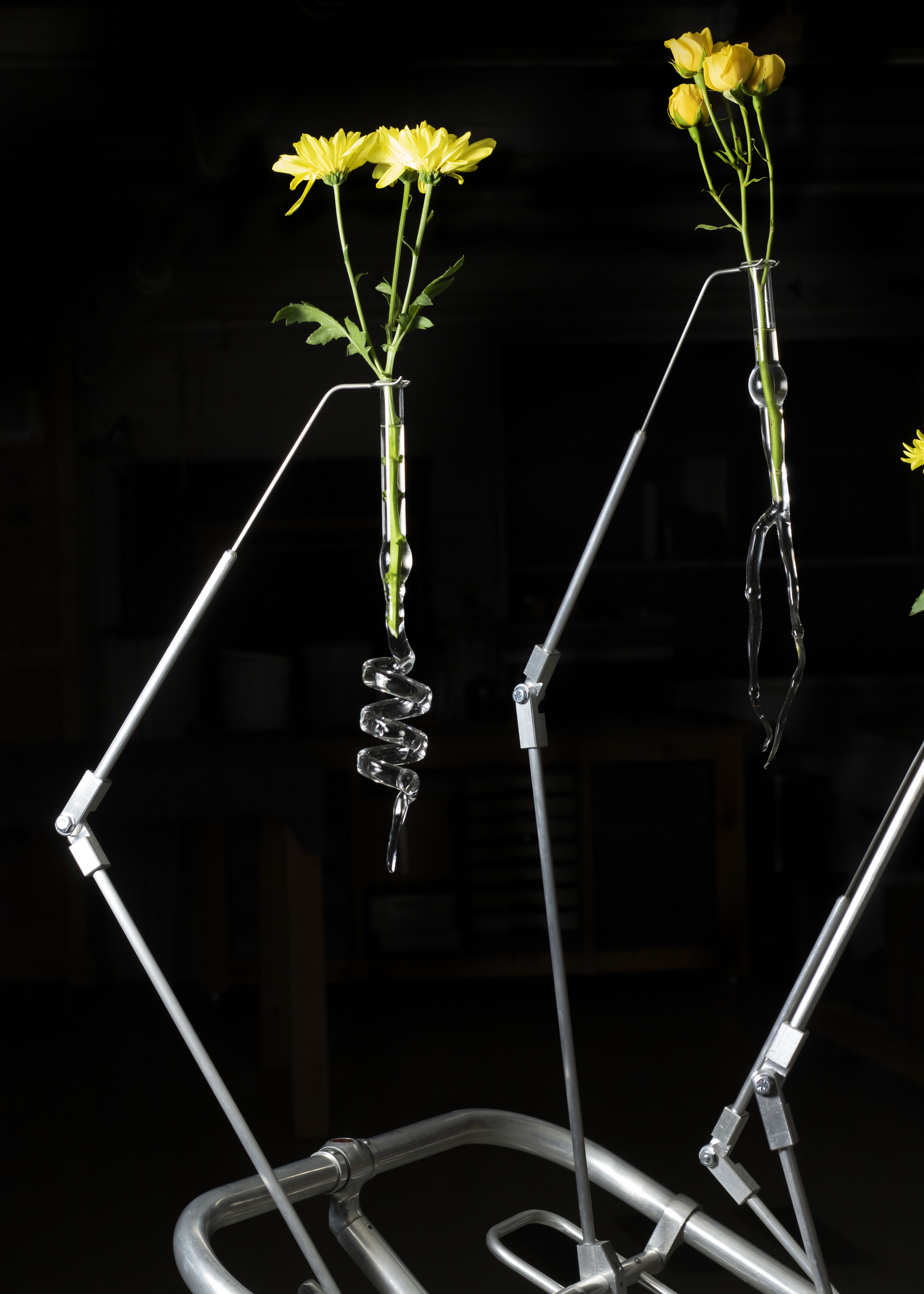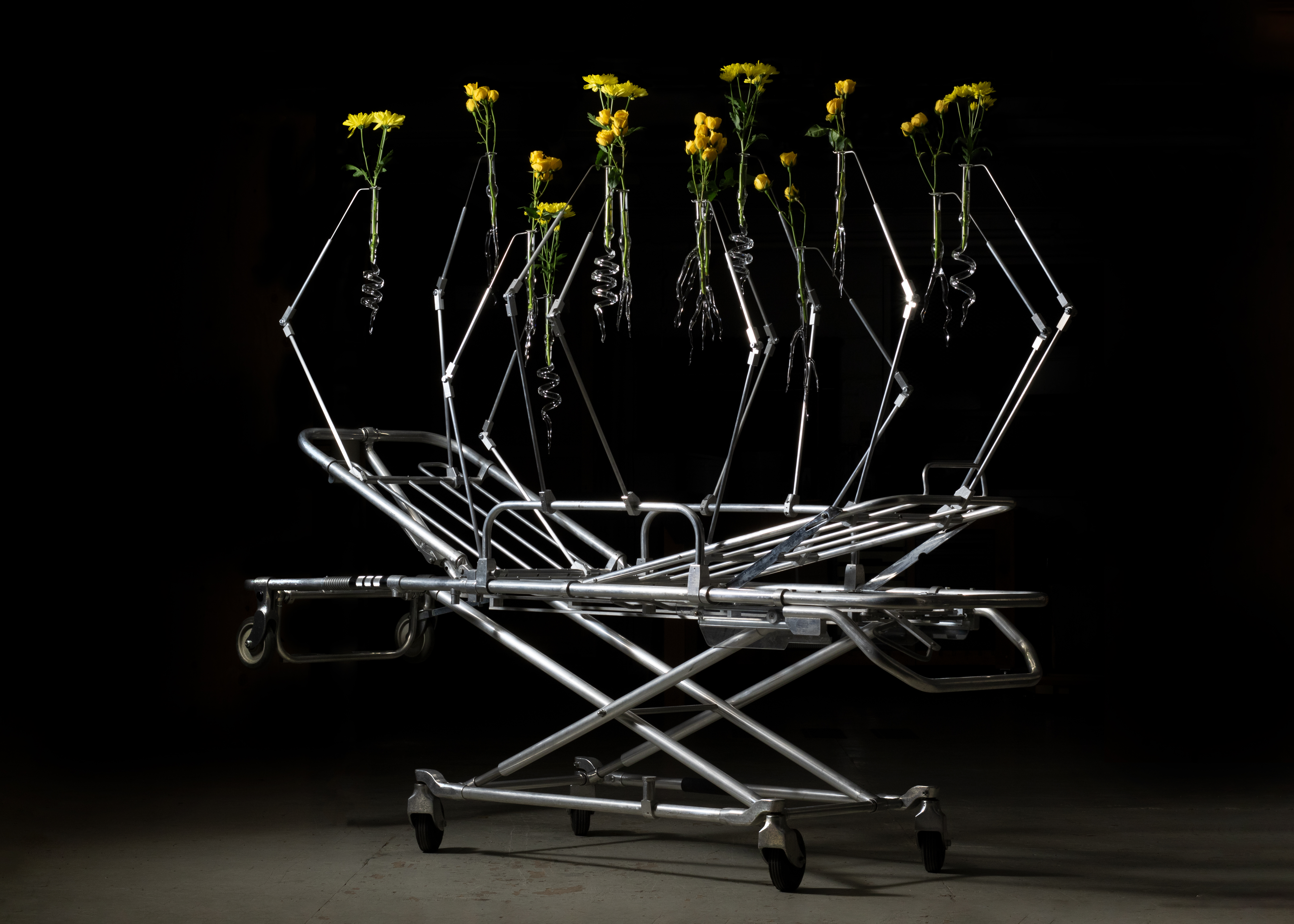 Machined and fabricated aluminum, hospital gurney, borosilicate glass, stainless steel, fresh flowers, water